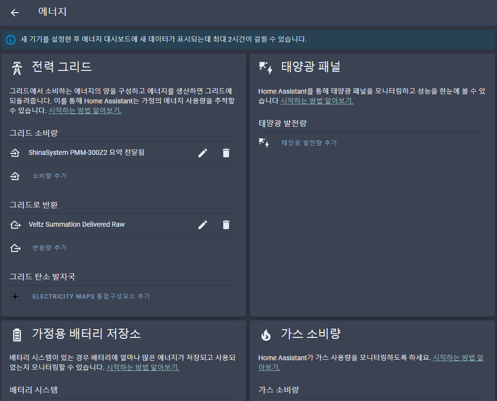 혹은 좀 더 단순하게 생각해서 "그리드 합계" 부분에는 ShinaSystem PMM-300Z2 요약 전달됨을 연결하고, 그리드로 보내는 값에 Veltz Summation Delivered Raw 값을 매핑하면 파워플래너앱에서 나오는 값과 다르기는 하지만 최종적으로 한국전력에서 얼마나 전기를 소비했는지 간접적으로 알 수 있는 듯합니다. 다시 말하면 태양광 발전량 중 얼만큼을 내부 소비하고 얼만큼을 송전했는지는 알 수 없지만, 수전량은 대략 파악 가능합니다.
