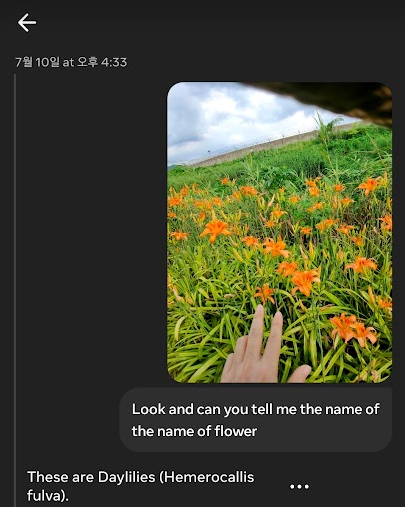 일상에서 그나마 궁금할 법한 꽃 이름을 한번 확인해 달라고 해 보았습니다. "Hey Meta, Look and tell me the name of the flower"라고 물어보니까, 원추리 꽃(못 알아들었고 나중에 구글 검색) 이라고 답해 줍니다. 그러면 즉시 사진을 찍은 후 말로 응답을 해 줍니다. "Look and"는 생략해도 된다고 합니다.