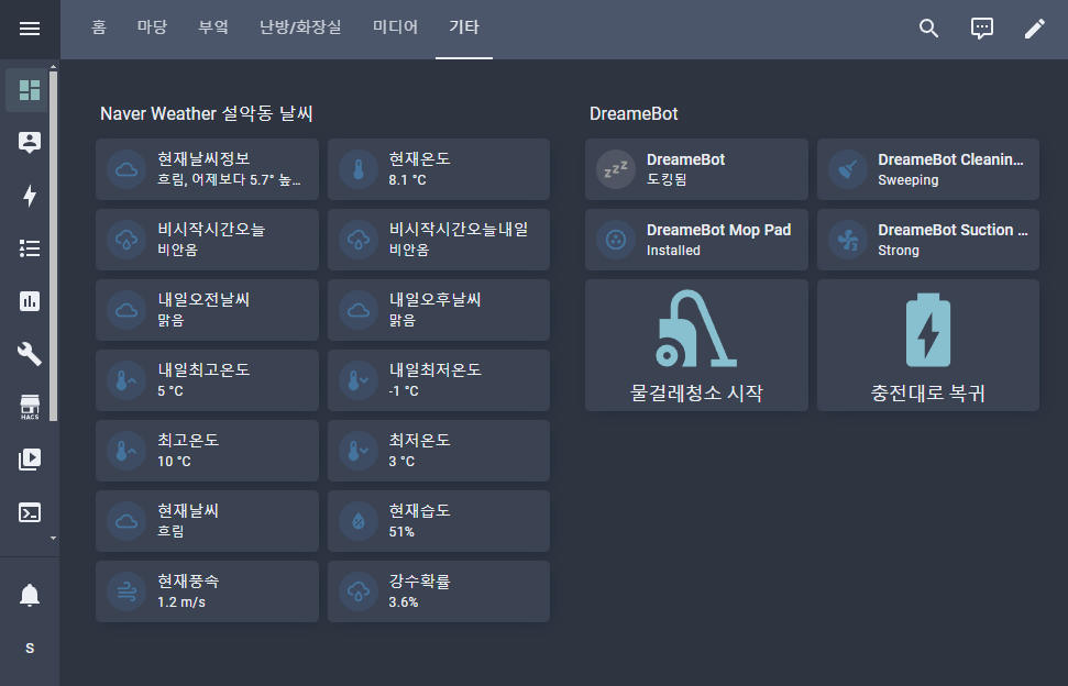 | 거실 | 1) 온습도 및 미세먼지, CO2 측정 2) 난방 자동 제어 3) 구형 에어컨 제어 4) Volumio 인터넷 라디오 자동 작동 5) 홈어시스턴트를 통한 구글 스피커 음성 안내 6) 댁내 전력 사용량 7) 드림봇 물걸레 로봇청소기 제어 |
