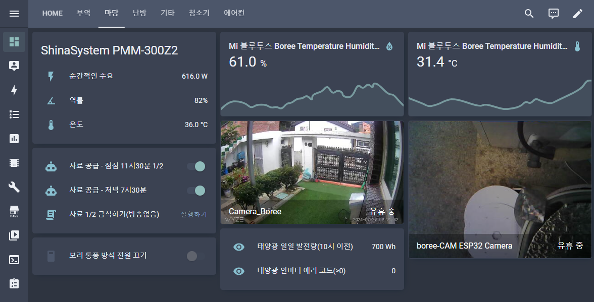 | 마당/옥상 | 12) 마당 감시용 웹캠 13) 구형 사료 급식 장치 원격 제어(DIY개조) 14) 사료급식 모니터링용 웹캠 15) 구형 태양광 인버터 발전량 측정 |