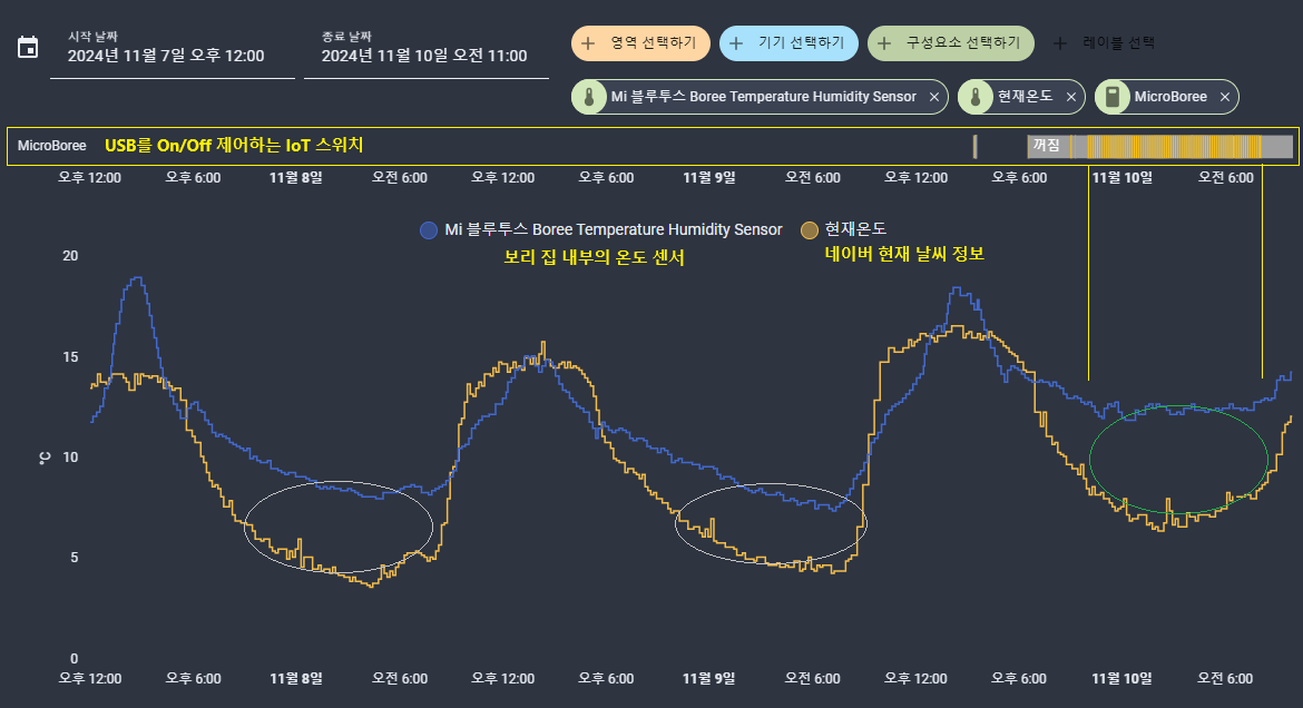 지난 며칠간의 리 집 내부 온도와 외부 기온 차이를 비교를 통해 온열 방석의 효과가 있는지 그래프를 통해 직관적으로 비교해 보았습니다.