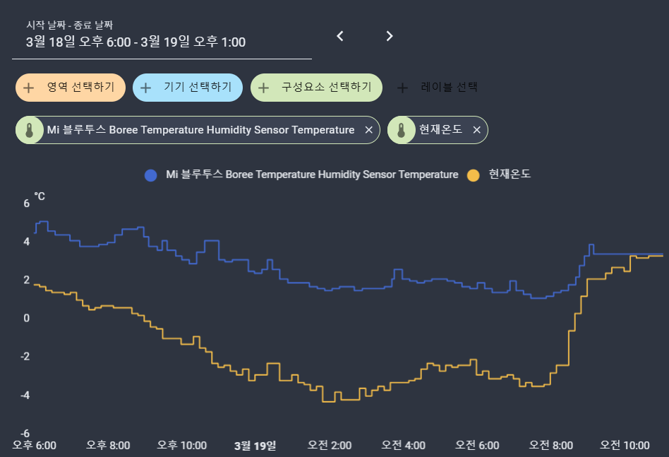방석 2개를 모두 켜면 외부 온도에 비해 잘 유지가 됩니다. 아래 파란색이 보리 집 내부 입구 벽에 설치된 온도계이고, 오렌지색은 네이버 날씨의 현재 온도 값입니다. 새벽에 영하 4도 근방까지 가지만 영상으로 잘 유지가 되었습니다.