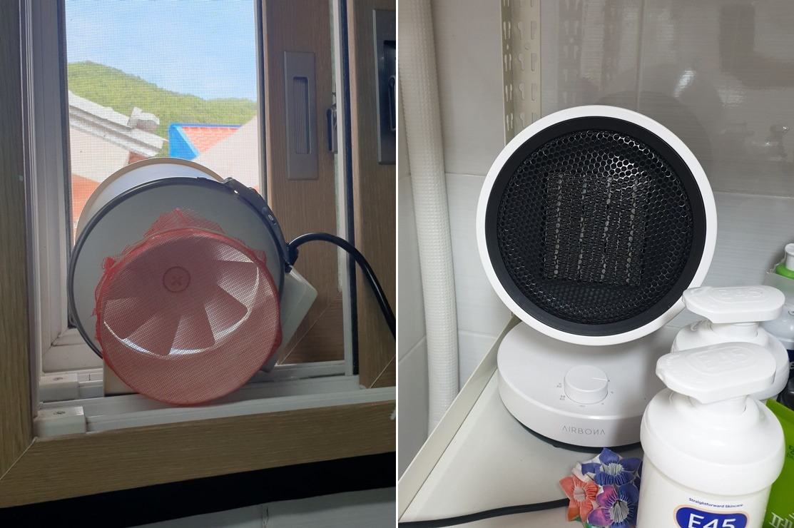 - 외부기온 10도 이하인 경우에는 PTC 히터 '중'강도 시 1,100W/h - 따뜻한 바람이 나와서 온도를 높이고 습도를 떨어뜨립니다. 그리고, 바닥 난방이 있기는 하지만 겨울에는 단열이 충분하지 않아 조금 추우므로 샤워하기 전에 틀어 놓고 들어가면 좋습니다. 환풍기를 켜지 않고 창문을 닫은 채로 짧게 샤워할 경우에 히터를 틀어 놓으면, 온도가 올라가면서 습도가 90%에 도달하지 않을 수도 있습니다. 평소 말하는 습도는 "상대습도"이기 때문에 온도가 높아지면 같은 양의 수분이 공기 중에 있더라도 상대습도는 낮게 나옵니다.