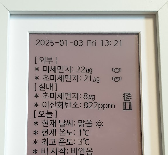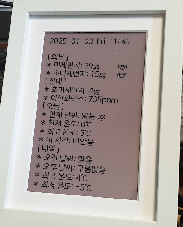 이케아 RIBBA 액자 13x18 안에 Waveshare 7.5inch E-Paper (B) Raw Display SPI without PCB와 Waveshare E-Paper ESP32 Driver Board 제품을 넣어서 만들었습니다.