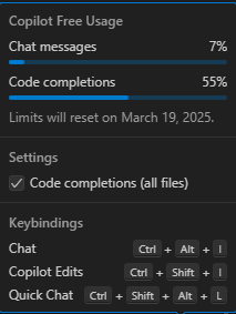 - 코드 일부를 선택해서 고쳐달라고 할 때에는 Github계정이 있는 사람에게 무료로 제공되는 Copilot기능을 사용하고 있습니다. 많이 사용하지 안않았는데도 55%나 이용했군요.