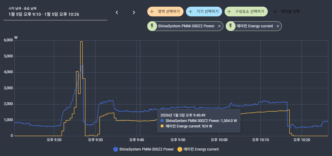 그래서 홈어시스턴트에 기록된 댁내 소비전력과 에어컨 소비전력을 아래의 차트로 그려 봤더니 순간으로는 6kW가 기록되어 있네요(이건 에어컨 내부 전력계 값).