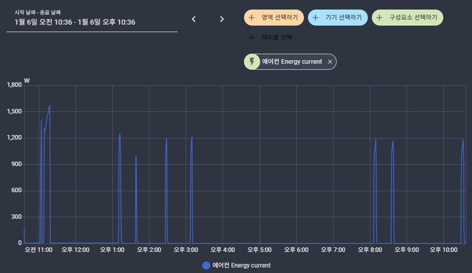 이해할 수 없는 증상이 있었는데, 에어컨 자체 온도계의 실내 온도가 18도인 상태에서 23.5도로 집중 5단 풍속 난방을 시켰더니, 순간적으로 소비전력이 치솟아서 제가 미리 만들어 놓은 순간 댁내 전력 4kW 초과 시 에어컨을 끄는 홈어시스턴트 자동화가 작동했습니다.