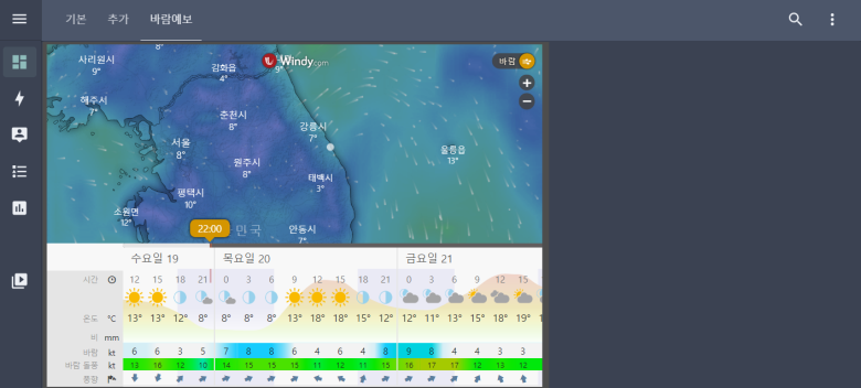 이 화면은 별 거 없고, windy 사이트에서 바람 예보를 보기 위한 것입니다. 농사를 짓는 경우 그리고 단독주택의 경우 바람이 얼마나 세게 부느냐에 따라 대처를 할 필요가 있으므로 넣어 보았습니다. 참고로 강원 영동지방은 태풍이 안왔는데 30m/s로 부는 경우가 다른 지방보다 더 있는 것 같아서 옥상에 있는 물건들, 창고의 문 등 단속을 잘 해야 합니다.