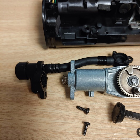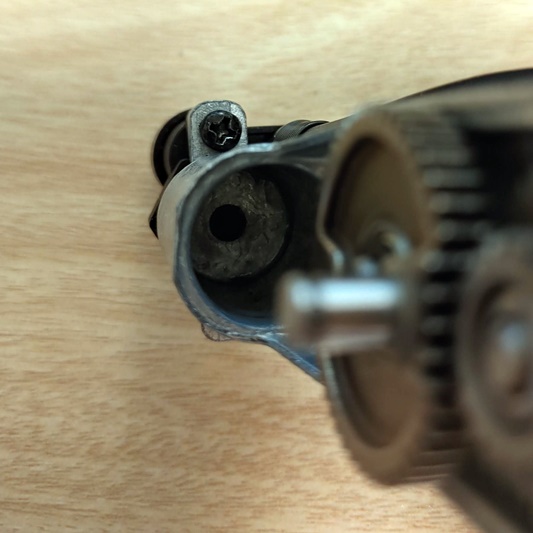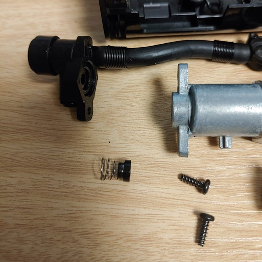 14) 실린더 내부에 가운데 검은 부분이 있는데, 플라스틱 부품이 막고 있습니다. 스프링이 달려 있어서 피스톤이 공기를 압축하면 순간적으로 밀렸다가 압력이 사라지면 스프링의 힘으로 닫히는 구조입니다. 저는 느낌상 저게 살짝 틀어져 있지 않나 싶었습니다... 위쪽에 나사가 보이시죠? 위 아래의 나사를 풀어줍니다.