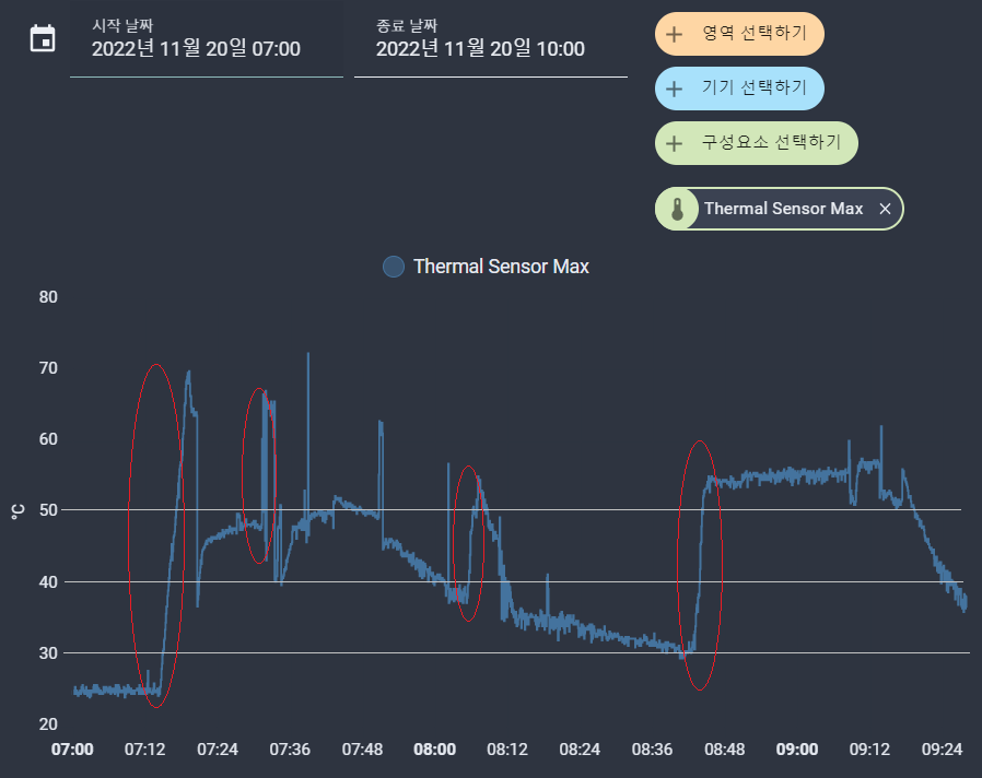 - 대략 50도를 넘으면 사용 중이라고 봐도 될 것 같고, 인덕션을 끄더라도 냄비를 치우지 않으면 온도는 서서히 내려갈 것입니다. => 이 기준은 센서와의 거리 등 영향이 있으므로 절대적인 값은 아니겠습니다.