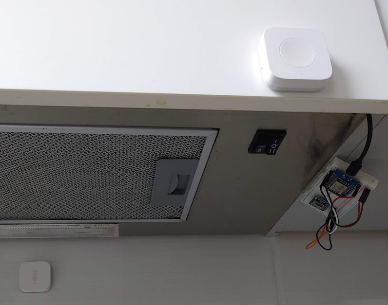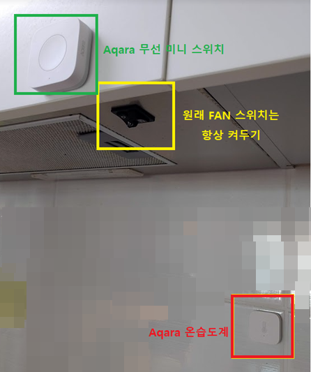 - 인덕션레인지 후드 근처에 IoT 온습도계(Aqara 온습도계)를 설치합니다.