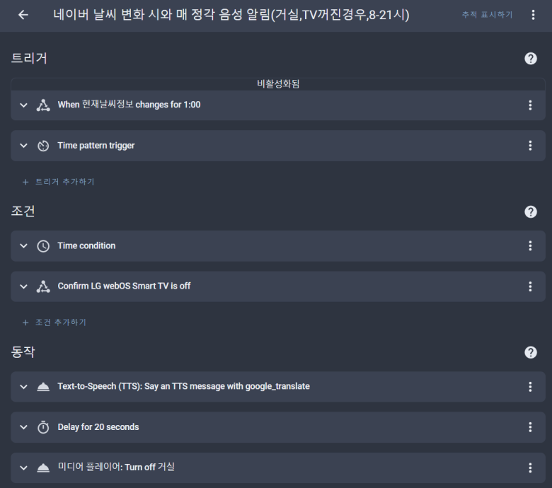 자동화한 내용은 다음과 같습니다. "When 현재날씨정보 changes for 1:00"은 위에 링크한 네이버 블로그 글을 보고 넣었던 내용인데, 날씨 정보가 변하면 말하도록 하는 것이고 저는 매시 정각에 말하도록 하므로 필요하지 않아서 비활성화하였습니다.