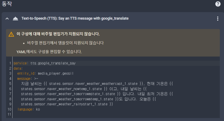 이제 네이버 날씨가 통합되었으므로, 날씨 갱신 내용을 음성으로 알려주도록 자동화를 하면 되겠습니다.