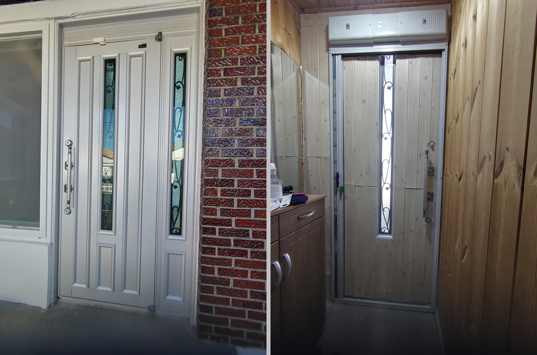 위 좌측 사진을 보면, 단열과는 완전히 거리가 먼 현관문이 설치되어 있습니다.