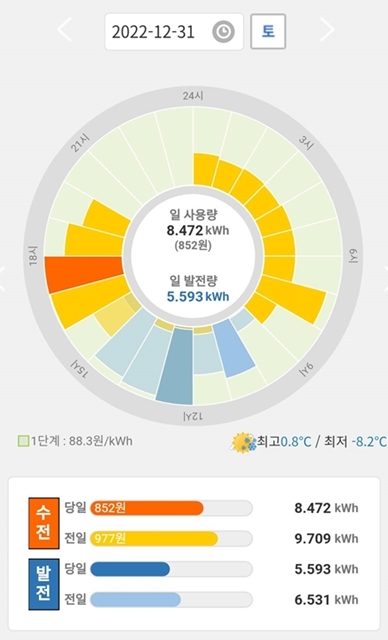 - 위 두 값을 더하면 실제로 소비된 월 평균 전력량을 추산할 수 있겠고, 163+308=471kWh로 이렇게 전기를 많이 쓰고 있었군요??? 이 값이 맞는 것인지 모든 가전 제품 소비 전력을 다시 체크해 봐야겠지만, 태양광 설치 이전에는 5~6만원이 나왔다고 하니 틀린 것 같지는 않습니다. 그 후로 냉장고를 2개에서 1개로 줄이고 하긴 했지만, 9kg건조기, 인덕션을 추가했고 에어프라이어와 서큘레이터, 공기정화기 등 상시 전원 사용량이 늘어났기 때문에 총량은 조금 준 정도일 것 같습니다.