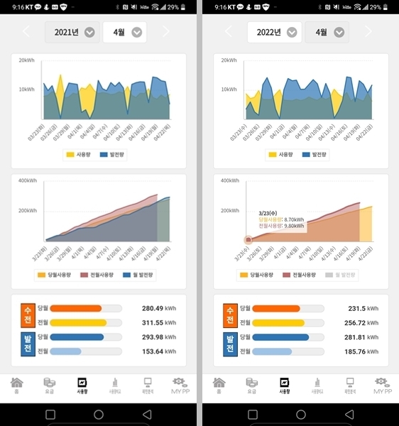 - 2022년 - 월평균 사용량 285kWh / 월평균 송전량 177kWh