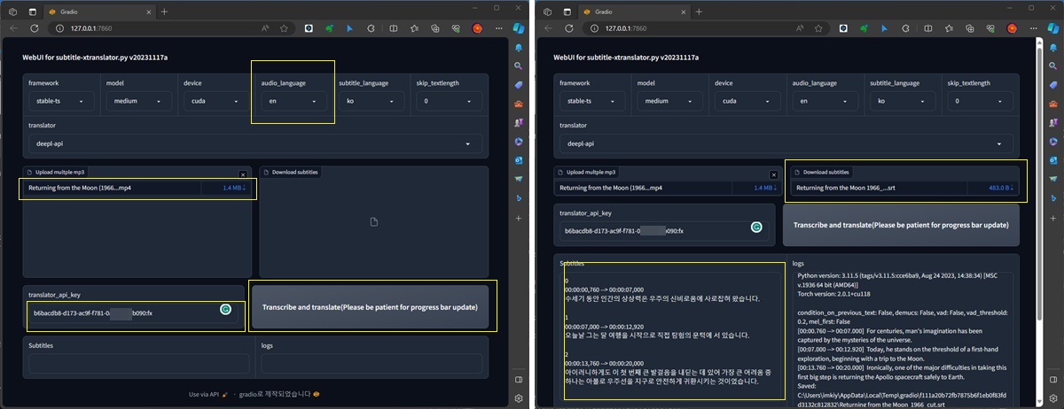아래는 stable-ts와 DeepL API 텍스트 번역을 이용하는 모습을 담은 영상입니다.