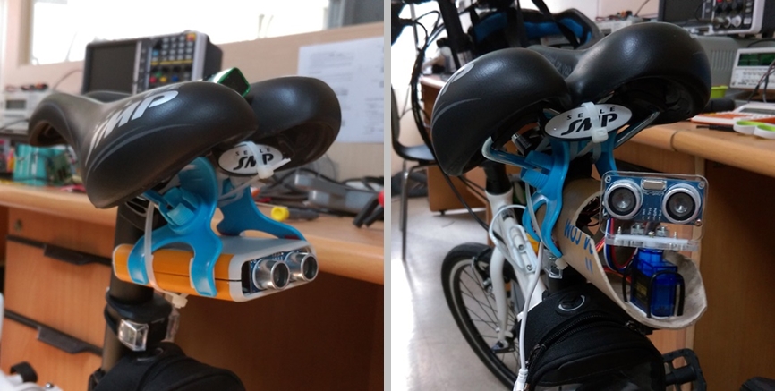 2016년에 아래와 같이 초음파를 이용하여 뒤쪽에 따라오는 자전거를 탐지하고자 했으나 그다지 쓸만하지 않았습니다. 인식했다가 못했다가...