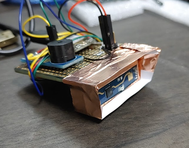 센서가 거리에 따라 8개의 게이트를 지원하고 감도를 조절할 수 있는데 가까운 엉덩이 인식은 감도 100%라서 소프트웨어로 필터링이 안될 것 같아서 하드웨어적으로 구리 테이프(GND에 연결은 안함)로 막아 보았습니다.