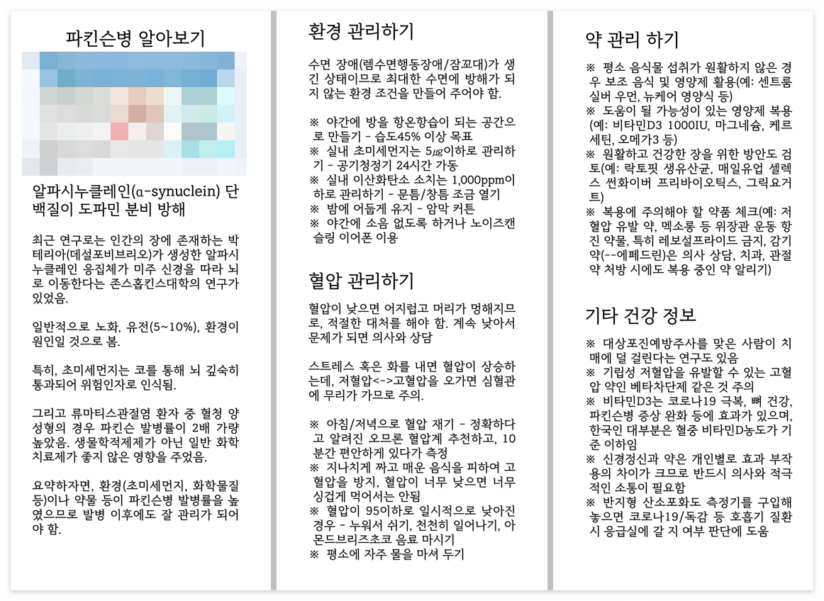 파킨슨병으로 고생 중이신 친척 분께 드리려고 책 만드는 것처럼 인디자인으로 작성을 해 보았습니다.