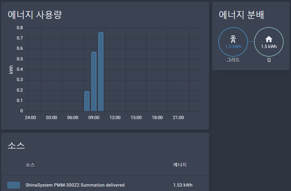 이제 홈어시스턴트의 "에너지"탭에 입력 값 중 하나를 처리한 셈입니다. 태양광발전도 있지만 RS-485로 연동한 것이 아니라서... => 2024/07 연결하였습니다.
