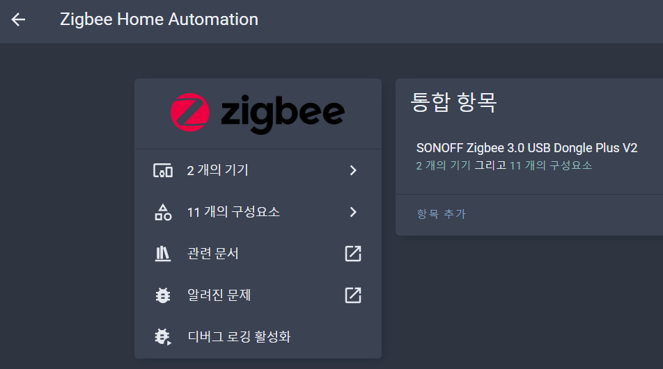 지그비로 구입했는데, 마침 얼마 전에 Sonoff의 USB타입 지그비 동글을 연결해 둔 상태여서 시하스 PMM-300-Z와 쉽게 연결할 수 있었습니다. PMM-300-Z의 M버튼을 5초간 누른 후 P0000부터 카운트다운을 시작하는데, 홈어시스턴트에서 설정 - 통합구성요소에서 ZigBee를 찾은 후 기기추가를 하시면 됩니다.