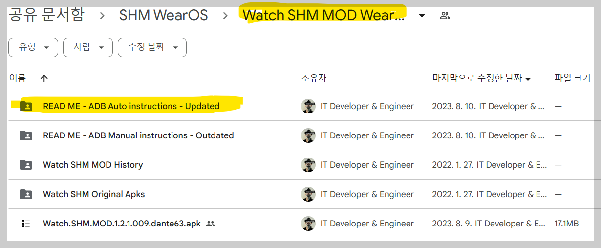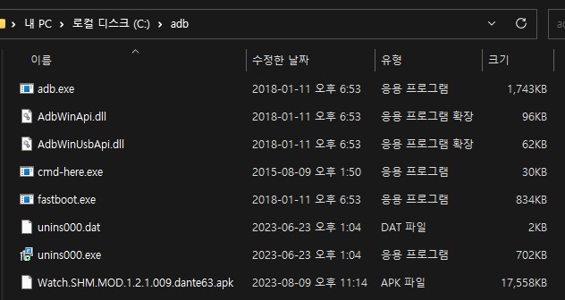 Minimal_ADB_Fastboot_v1.4.3.zip 을 다운로드 합니다(Watch SHM MOD Wear OS\READ ME - ADB Manual instructions 밑에 위치)이하 여기에서는 같은 디렉터리의 English (EN).txt의 내용대로 따라 하는 것입니다.C:\adb 위치에 Minimal_ADB_Fastboot_v1.4.3.zip를 압축 해제합니다. 여기에서 adb.exe를 실행할 예정입니다.Watch SHM MOD Wear OS\Watch.SHM.MOD.1.2.1.009.dante63.apk를 C:\adb에 같이 복사해 둡니다.