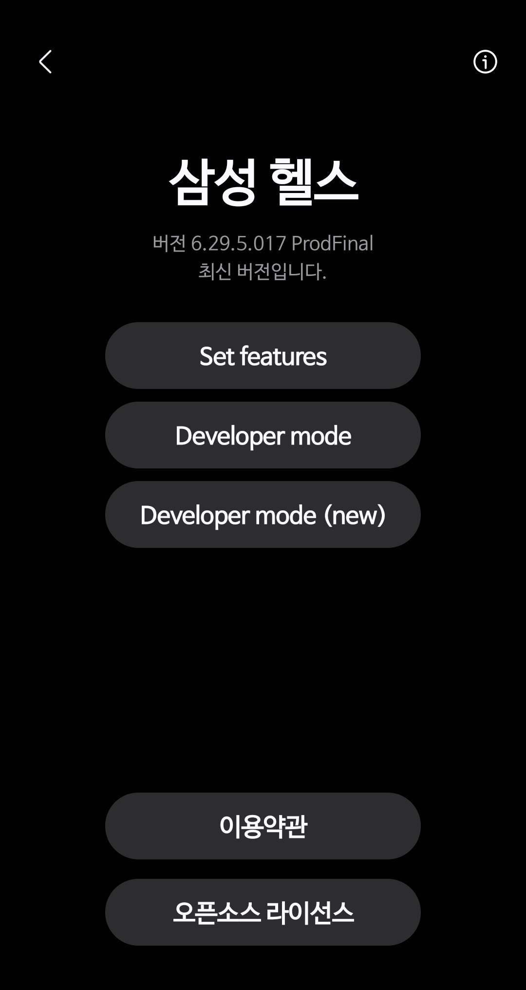 아래 사진은 삼성 헬스 스마트폰 앱의 "설정" 밑에 있는 "삼성 헬스 정보" 메뉴를 선택하면 나오는 화면인데 버전 번호를 계속 누르다보면 아래 쪽에 버튼 3가지가 새로 나타나게 되며, Set features 버튼을 누르고 개발자 관련 2종 설정을 마치면 됩니다.