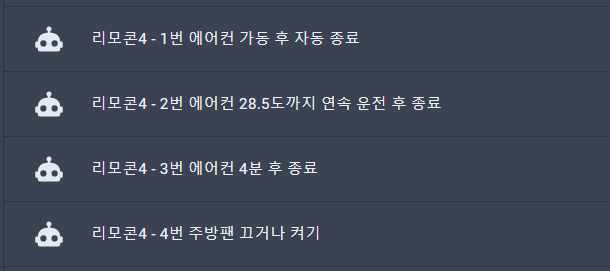 4버튼 리모트 스위치 중 1번에는 "에어컨 가동 및 13분 후 자동 종료하기"를 연결하고, 2번에는 "에어컨 28.5도까지 연속 운전 후 종료", 3번에는 "에어컨 송풍 4분 후종료하기"를 매핑하였습니다. 4번은 주방 환풍기 전원 토글(전환)으로 연결해 보았습니다.