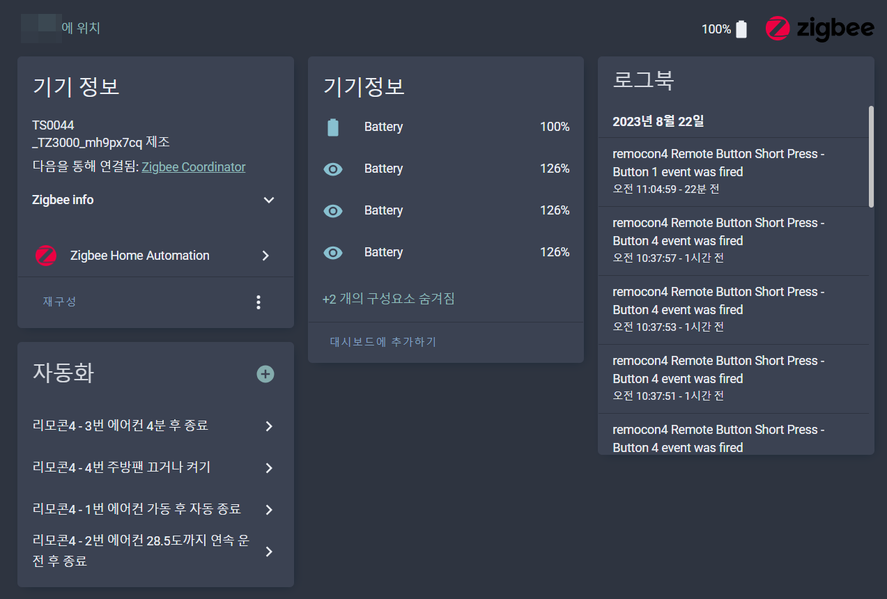 자동화는 바로 위 화면에서 + 를 눌러서 추가하면, 각 버튼을 짧게 누르기, 길게 누르기, 두번 빠르게 누르기 등을 쉽게 선택해서 작업할 수 있었습니다. 기기 정보에 배터리가 표시되는 것은 좀 이상하긴 하지만 사용에 지장이 없으니 넘어갑니다.