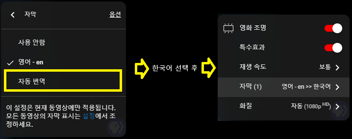 영어 자막을 기본 제공하지 않는 경우 영어 자막이 자동 생성되는 영상을 많이 보게 됩니다(물론 자동 생성 자막조차 없는 경우도 간혹 있습니다). 유튜브가 제공하는 한국어로의 자동 번역을 사용하려면 톱니바퀴 메뉴의 자막 옵션에서 "자동 번역" 을 선택하면 됩니다.