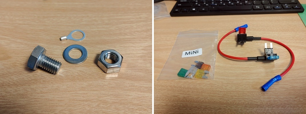 "경비원"님의 영상에서는 GND 연결 부분의 상세 내용이 생략되어 있는데, 아무리 찾아 보아도 차체에 접지 할 부분이 보이지 않더군요. 그래서 "라메니닷컴"의 영상을 참고하여 위 볼트 너트 방식으로 연결했습니다. 압착 방식의 원형 터미널 단자도 내경이 10mm인 것을 골라서 M10 볼트 너트와 터미널 단자(볼트 너트와 별도 주문)를 주문했습니다.