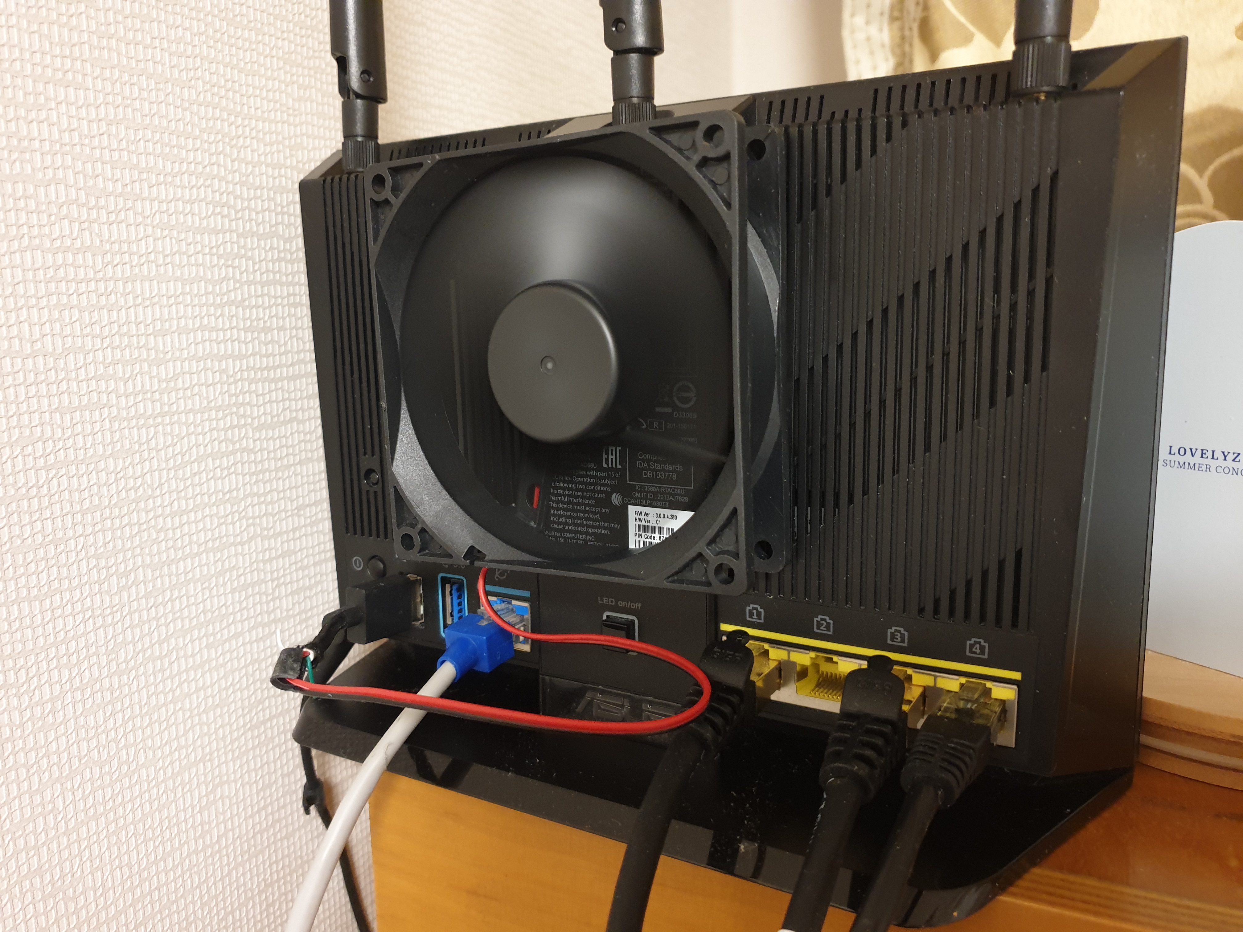 공유기의 중앙에는 좌측이나 우측과 달리 숨구멍이 없어서 냉각 효율은 좀 떨어지지만, 그래도 붙이고 나니까 AC68A는 68도 가량으로 유지가 되고, 고향집에 있는 AC1900P는 60도가 나옵니다(역시 12V 팬을 쓰고 있지만 알리익스프레스에서 주문한 것이 오면 교체 예정).