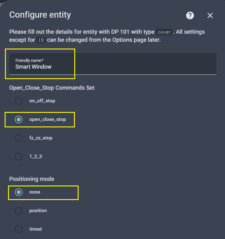목록에서 Smart Windows and doors를 선택합니다. 장치 종류는 Cover로 선택해야 합니다.