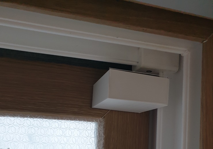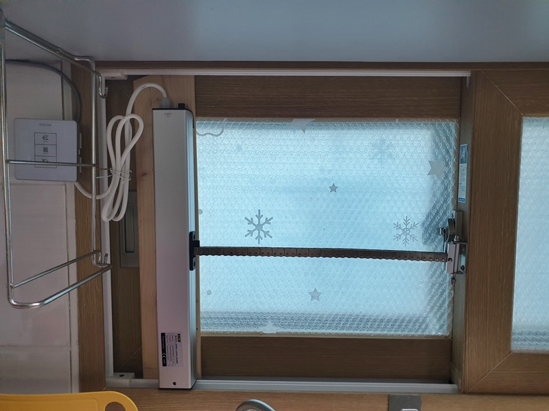 마지막으로 창문을 평소에 닫아 놓고 이산화탄소 수치가 충분히(?) 올라갔을 때 활짝 여는 방법을 고려했는데, 사람은 잊을 수 있으므로 자동화를 해보기로 했습니다. 아래는 여닫이용으로 개발된 제품인데 미닫이 문에 (우격다짐으로) 적용해 봤습니다.
