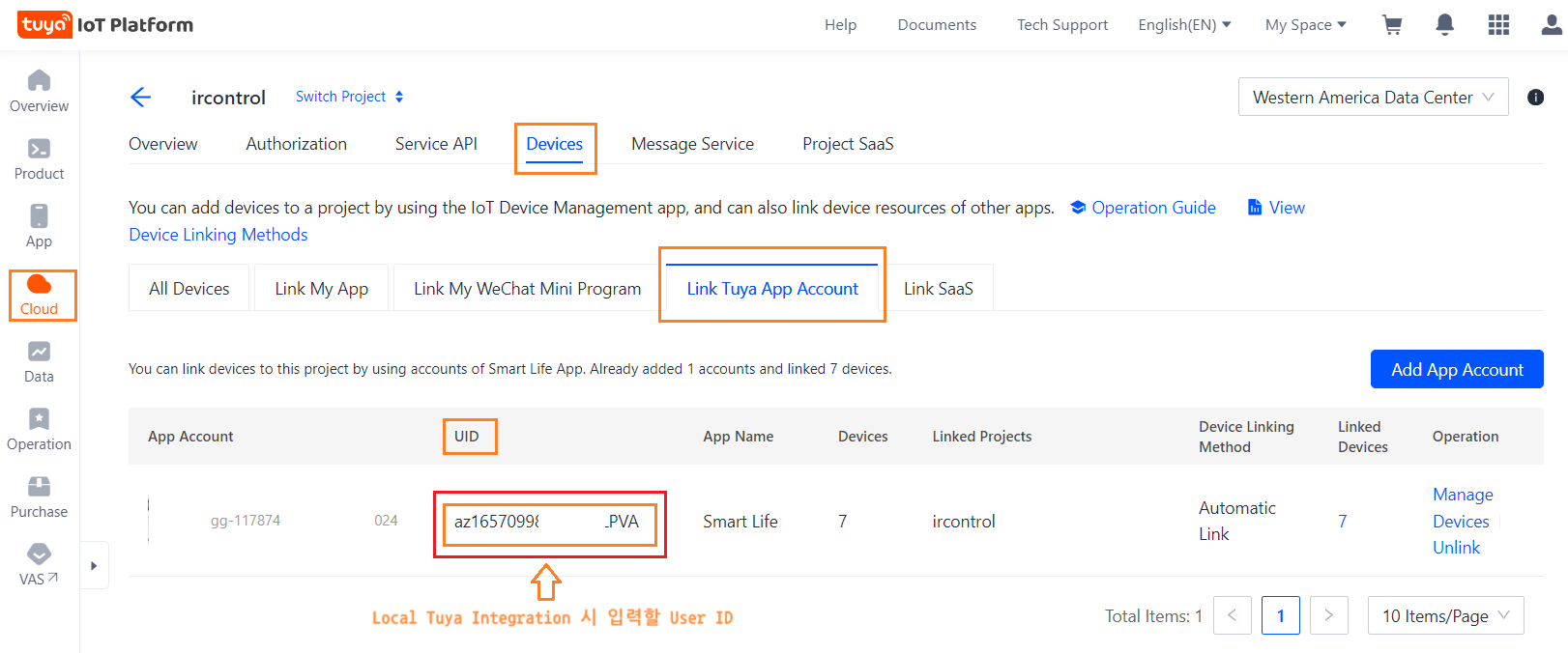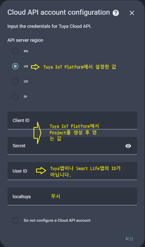 - 주의할 점 = 홈어시스턴트의 Integration에서 Local Tuya를 추가할 때 입력 항목 중에 User ID가 있는데 Smart Life 앱이나 Tuya 앱의 User ID가 아님에 유의해야 합니다. Tuya IoT Platform에서 생성한 클라우드 프로젝트에 연결된 App의 UID 값입니다. 보통 Smart Life앱을 등록하게 됩니다.