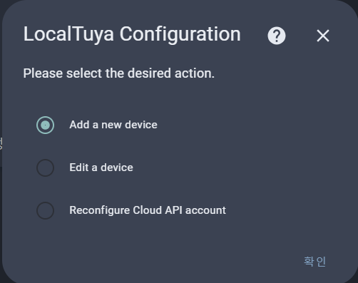 Home Assistant의 HACS에서 Local Tuya Integration을 추가하고 통합구성요소 추가하기에서 LocalTuya Integraion을 선택하고 설정을 하다보면 다음 화면이 나옵니다.