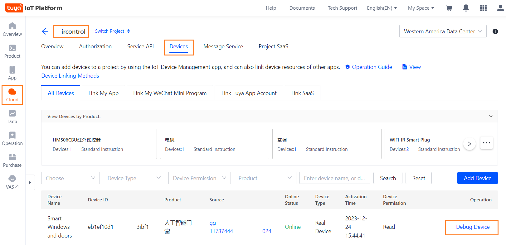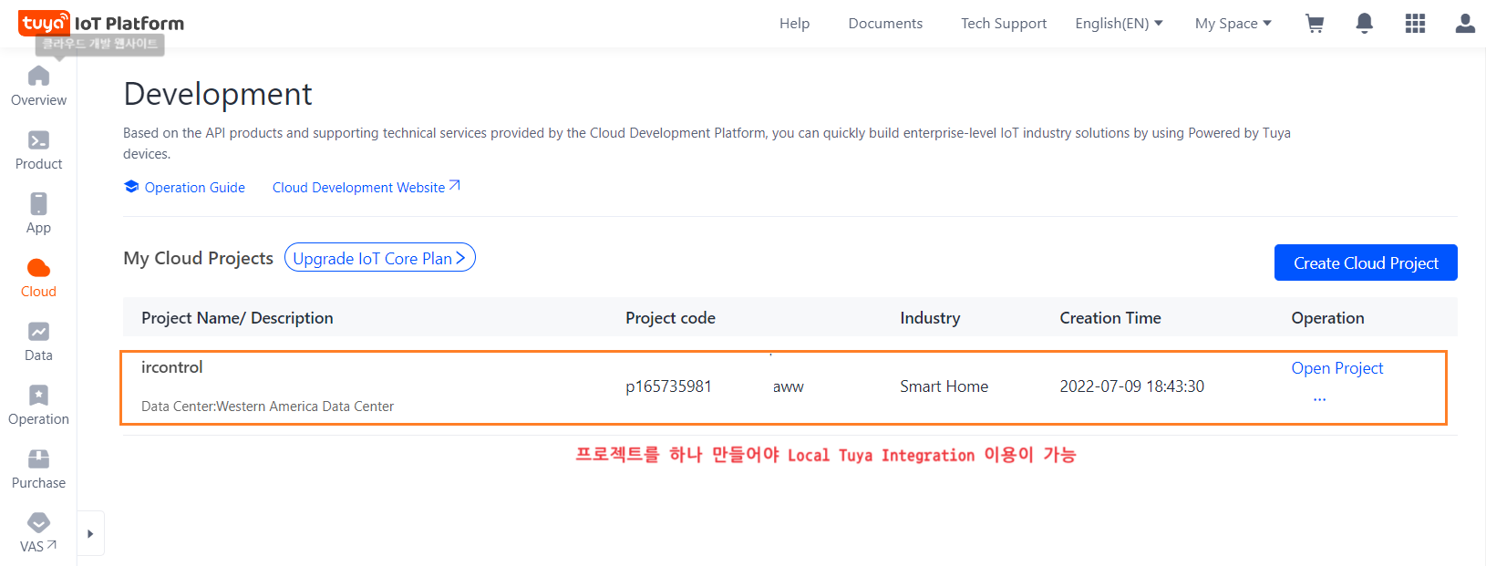 어려운 것은 없지만 참고 삼아 Tuya IoT Platform의 화면을 몇 가지 보여드리겠습니다. 프로젝트가 하나도 없다면 Create Cloud Project를 통해서 만들어야 합니다.