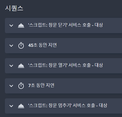 창문 닫기와 창문 열기 스크립트를 만들어서 자동화 작업을 편하게 합니다(닫기 및 열기는 여닫이용이라서 미닫이와 반대의 값).