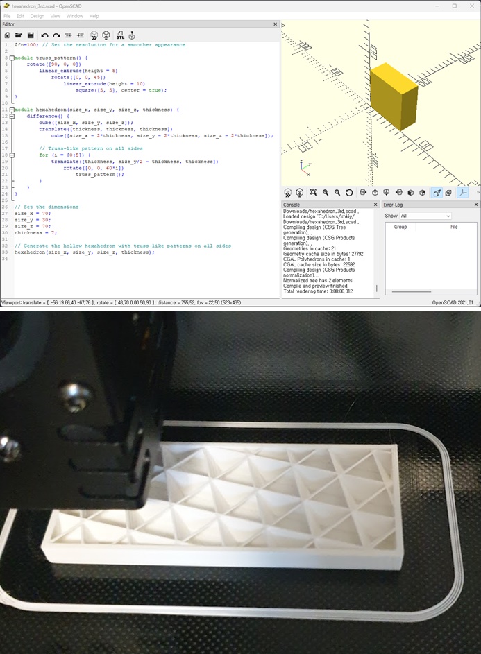 아직 3D 설계는 배우는 중이라서 ChatGPT에게 물어봤더니 OpenSCAD용 스크립트를 주더군요. Bard는 .SLT를 줬는데 읽을 수는 없었습니다. ChatGPT는 3D 인쇄 필라멘트를 아껴 달라고 하니까 트러스 구조 패턴을 넣어주기까지 하네요.