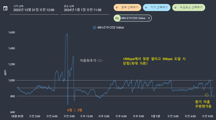 1000ppm에서 창문을 열고 900ppm이 되거나 15분이 경과하면 창문을 닫도록 자동화 적용해 본 결과 아래와 같이 이산화탄소 수치가 변화합니다.
